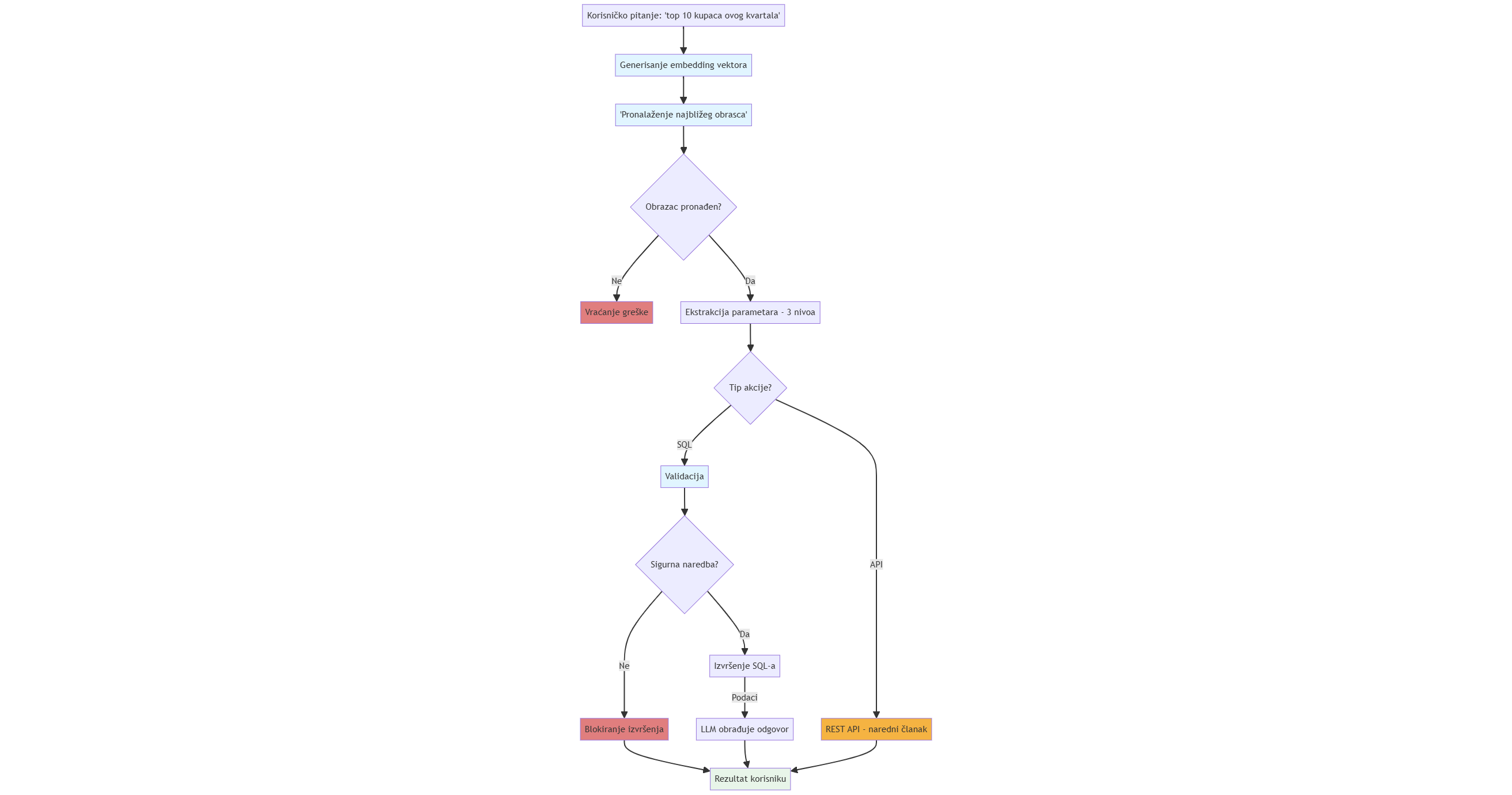 Slika: Dijagram toka hibridnog NL2SQL sistema. Od korisničkog pitanja do odgovora ili akcije.